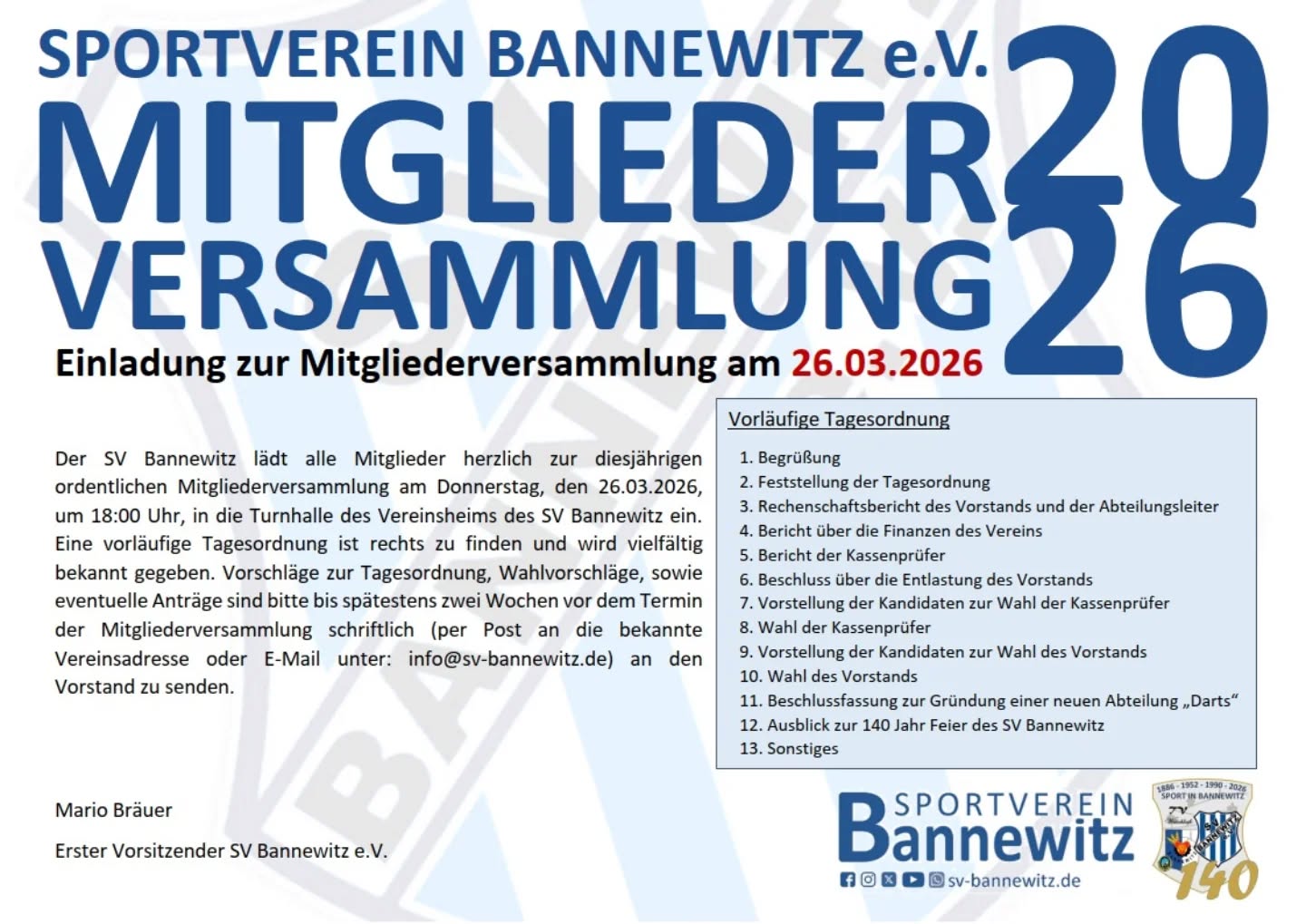 Der SV Bannewitz lädt alle Mitglieder herzlich zur diesjährigen ordentlichen Mitgliederversammlung am Donnerstag, den 26.03.2026, um 18:00 Uhr, in die Turnhalle des Vereinsheims des SV Bannewitz ein. Eine vorläufige Tagesordnung ist rechts zu finden und wird vielfältig bekannt gegeben.